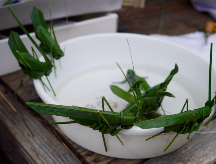 シュロの葉で繊細なバッタの草細工をする竹地巌さんに出会います。