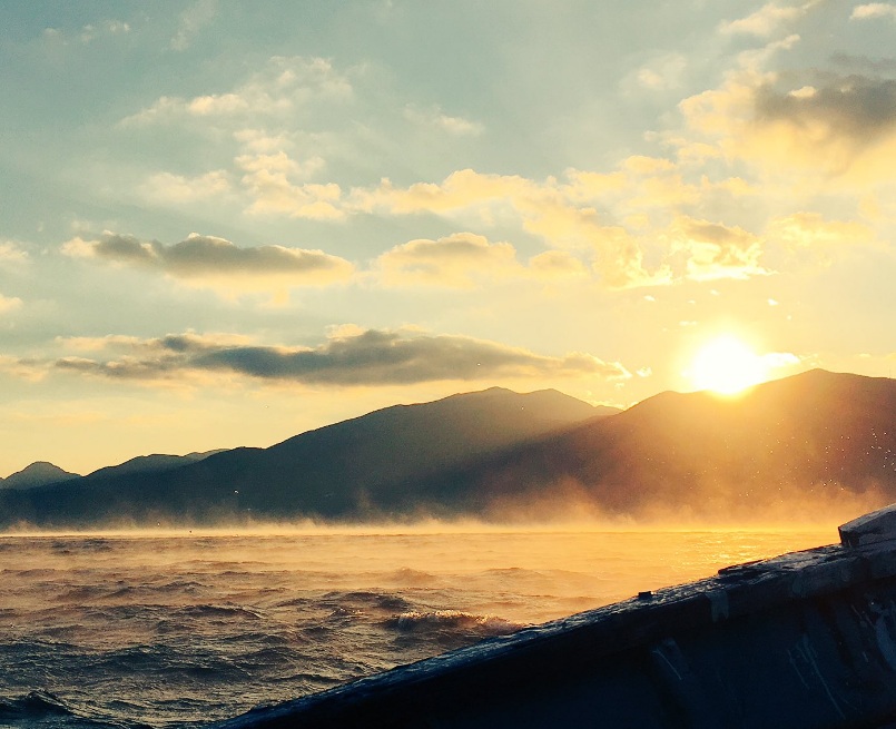 その題材となった大洲の自然現象「肱川あらし」は、初冬の朝、冷え切った大洲盆地で発生した霧が肱川を伝って海へと流れ、強風が河口を吹き抜ける現象です。世界に類を見ない愛媛県大洲市でのみ観察されます。