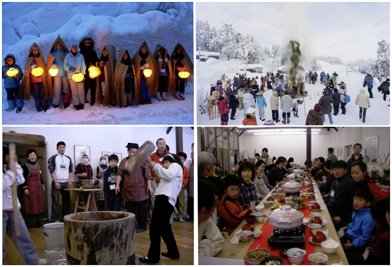 全国から伝統行事(鳥追い、餅つき、どんど焼き、お祝い料理)を体験したい親子と地元の子供たちが一緒になって小正月の行事を楽しむ「越後妻有の林間学校」が開かれていました。
