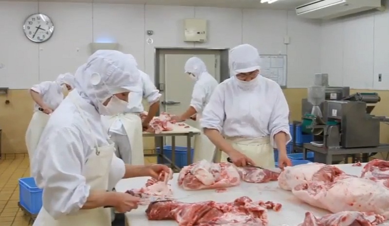 美味しい“明宝ハム”を作る工程の中で一番、手間がかかるのが肉の解体作業で、細かい筋の1本1本まで取り除きます。