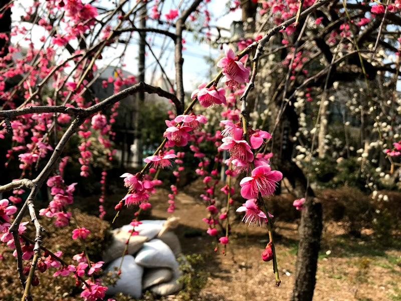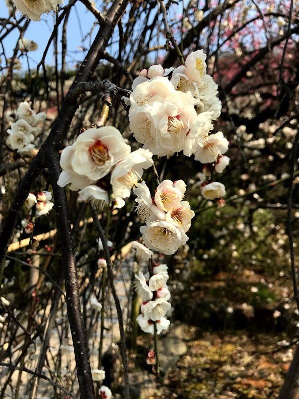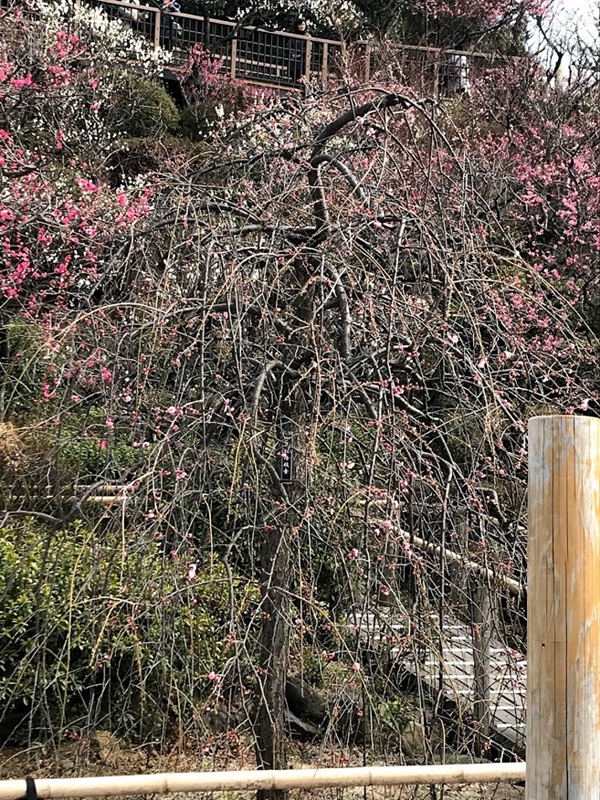 撮影は2月下旬のため、開花の時期が緑萼枝垂よりも早い「玉垣枝垂(たまがきしだれ)」が見事に満開でした!